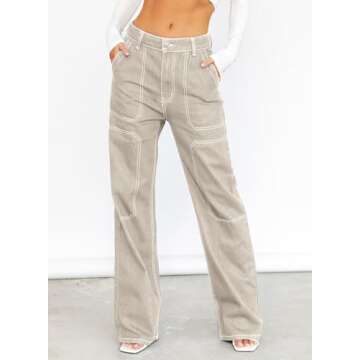 Dokotoo Womens Casual High Waisted Cargo Jeans for Women Wide Leg Boyfriend Denim Pants Apricot Size 8
