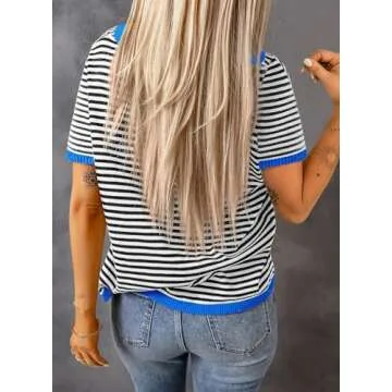 Dokotoo Womens Crewneck Tops Summer Casual Color Block Short Sleeve T-Shirts for Women 2025 Fashion Fall Striped Knitted Top Lightweight Top for Women Trendy Blouses Sweaters Black Small
