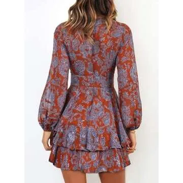 Dokotoo Womens Junior Casual Summer Beach Spring Ruffle Elegant Floral Long Sleeve Tie Knot V Neck Cute Chiffon Boho Beach Hawaiian Tunic Swing A Line Mini Short Skater Dresses for Women 2024 Red S