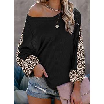 Dokotoo Womens Ladies Floral Patchwork Winter Blouses Color Block Long Sleeve Loose Slouchy One Shoulder Waffle Knit Oversized Sweaters Pullover Sweatshirts Fall Tunic Tops Baggy Shirts Black M