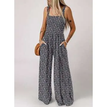 Dokotoo Womens Overalls Jumpsuits for Women Casual Loose Fit Solid Color Wide Leg One Piece Sleeveless Jumpsuit Printed Long Pant Rompers with Pocket Blue Medium