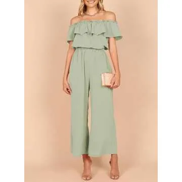 Dokotoo Womens Plus Size Jumpsuits for Women Casual Off The Shoulder Short Ruffle Sleeves Stretchy Wide Leg Solid One Piece Long Pant Romper Jumpsuit with Pockets Green X-Large