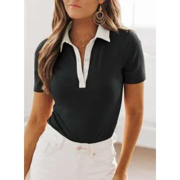 Dokotoo Womens Shirts Business Casual Outfits for Women Short Sleeve Button Down Shirts for Women Collared Work Tops Basic Slim Fitted Button Down Polo Shirts V Neck Tops Black Shirts for Women S