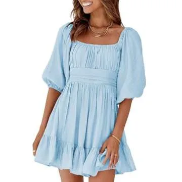 Dokotoo Womens Summer Dresses Square Neck Tie Back Lantern Sleeve Blue Wedding Guest Dresses Ruffle A-Line Sexy Dresses Elastic Waist Casual Dresses for Graduation Small