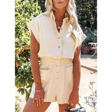 Show moreIntroducing the Dokotoo Women's Summer Utility Rompers 2024, a true blend of style and functionality. Crafted from high-quality cotton fabric, this romper is not only comfortable and breathable but also designed for all-day wear, making it a perfect choice for any occasion. The durable material is resistant to friction and scratches, ensuring long-lasting performance. Initially, the fabric may feel a bit stiffer, but rest assured, it softens beautifully after washing, providing an effortlessly chic experience. This romper features basic lapel collar styling, cuffed short sleeves, and a flattering elastic high waistline, creating a sleek silhouette that beautifully enhances a woman's curves.