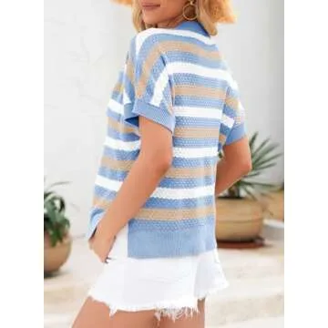 Dokotoo Womens Tops Fashion Ladies Summer V Neck Short Sleeve Tunic Tops and Blouses Striped Contrast Block Knit Pullover Sweaters Casual T-Shirts Work Business Loose Shirts Sky Blue Small