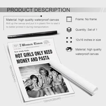 DOLJKCS Black And White Newspaper Wall Art Vintage Room Decor Aesthetic Poster Funky Hot Girl Eating Pasta Canvas Prints for Italian Kitchen Girly Bedroom 12x16 Inch Unframed