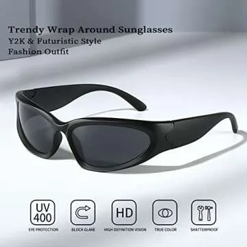 Show more Introducing the Dollger Trendy Wrap Around Sunglasses, where modern style meets exceptional functionality! Embrace the Y2K fashion revival and elevate your accessory game with these stunning vintage oval sunglasses. Crafted for both men and women, these sporty shades feature a futuristic wrap design that not only turns heads but also provides maximum comfort and protection. The unique curved wraparound style is tailored to fit your face seamlessly, ensuring a secure and stylish fit every time you wear them.