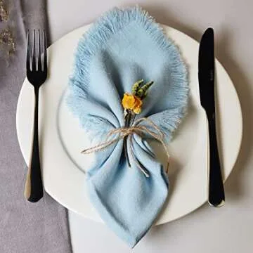 Dololoo Handmade Cloth Napkins with Fringe,18 x 18 Inches Cotton Linen Napkins Set of 4 Versatile Handmade Square Rustic Fringe Napkins for Dinner, Wedding and Parties, Blue