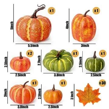 DomeStar 38pcs Fall Pumpkins Decor Set, Fake Pumpkins 8pcs Assorted Pumpkins with 30pcs Artificial Maple Leaves, Fall Harvest Centerpieces for Tables Thanksgiving Halloween Decorations