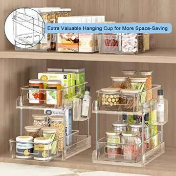 DOMNIU 2 Tier Clear Organizer with Dividers, Pantry Organization and Storage Multi Purpose Slide-Out Bathroom Organizer, Kitchen Pantry Medicine Cabniet Bins, Under Sink Organizer with Hanging Cup