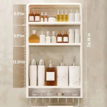 Show moreIntroducing the Domus Realm Shower Caddy Shelf Organizer Rack, the ultimate storage solution designed to revolutionize your bathroom organization. Gone are the days of cluttered countertops and chaotic shower spaces. Crafted with a stylish white finish, this self-adhesive shower caddy offers an impressive three-layer design complete with drawers, hooks, and a towel rack to efficiently accommodate all your bathroom essentials. Easy installation ensures no tools are required, making it a hassle-free addition to your home. Attach securely to marble, ceramic tiles, glass, smooth wood, or metal with our strong adhesive system, knowing your walls remain untouched and pristine.