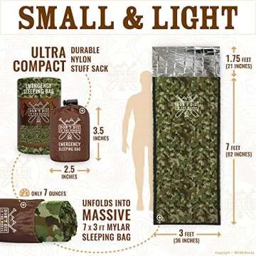 Show more Experience the ultimate in emergency preparedness with the DDITW Emergency Sleeping Bag, the toughest mylar sleeping bag on earth. Made with a unique, tear-resistant, and extra-thick HeatFlex mylar, this sleeping bag is built to withstand the elements better than ordinary space blankets. Designed with a built-in hood to keep your head warm and reinforced tape seams for durability, it's lightweight and compact, making it easy to carry on any adventure.