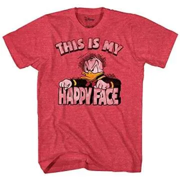 Introducing the officially licensed Disney Donald Duck Angry Grumpy "This Is My Happy Face" T-shirt by Mad Engine—a unique and playful addition to any Disney fan’s wardrobe. This t-shirt showcases a vibrant, full-color graphic of a classic, grumpy Donald Duck, perfectly paired with the humorous phrase, "This is my happy face." Crafted from high-quality, soft, and comfy fabric, this shirt not only exudes charm but is also designed for comfort and durability, making it...