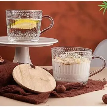 Show moreDiscover the exquisite charm of the DONYU 2 Pack 14.5 oz Glass Coffee Mug with Lid. Crafted from high-quality, durable glass that is free from phthalates, BPA, and lead, these mugs are designed to be both safe and sophisticated for everyday use. The intricate embossed designs not only offer a textured feel in hand but also add a touch of vintage elegance that elevates your drinking experience. Perfectly sized for your morning brew, afternoon tea, or late-night dessert, these versatile mugs cater to all your beverage needs.