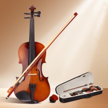 The package includes a soft-lined case, a bow made from arbor with white horsehair, and rosin to enhance sound quality.
