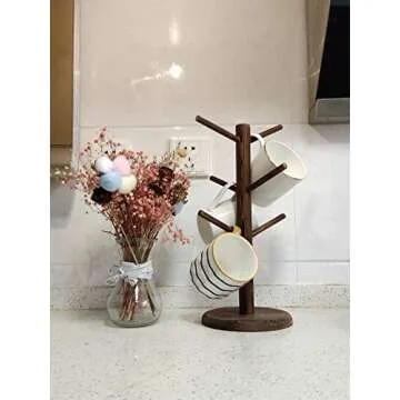 Show more Introducing the ultimate solution for mug organization – the Versatile Coffee Cup Tree. This charming and practical coffee mug stand is designed with 6 sturdy hooks to hold your favorite mugs securely, making it an essential addition to any kitchen or coffee bar. Crafted from natural wood, its rustic wood grain enhances any interior decor, providing both functionality and style. No more messy cabinets or cluttered countertops; with this mug tree, you can keep your space tidy while showcasing your beloved mugs at your fingertips.