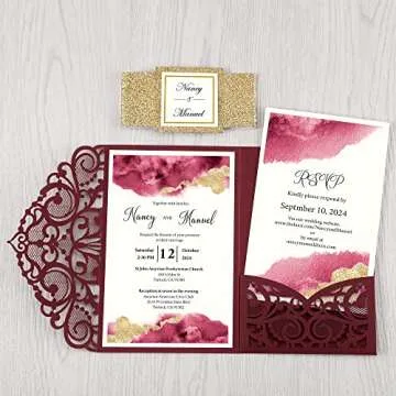 Show more Discover the ultimate wedding invitation kit that brings your dream ceremony to life. This all-inclusive package features 100 blank wedding invitation inner sheets, 50 exquisite wedding invitation pockets, and 50 stunning gold glitter belly bands. Designed meticulously for couples, each piece in this collection is crafted with high-quality laser cutting technology to ensure elegance and charm. The inner sheets, sized 4.3 x 6.7 inches, provide a clear writing surface, perfect for your personalized messages. Completing the set are 50 envelopes and 50 seals, not to mention 13 uncut blank papers for customizable tags that add a personal touch to your invitations.