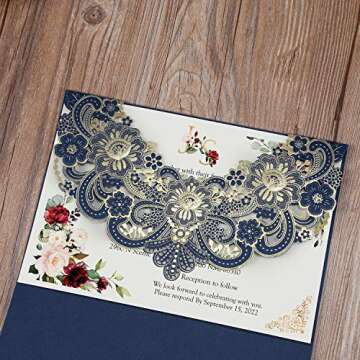 Show moreExperience elegance and charm with the DORIS HOME 50pcs Navy Blue Laser Cut Flora Lace Invitation Cards. Designed for every special occasion, these exquisite invitations blend intricate artistry with modern functionality. Each card measures 5 x 7.2 inches, featuring beautiful laser-cut floral designs that provide a stunning visual appeal for weddings, bridal showers, engagements, birthdays, bachelorette parties, and baby showers. Accompanied by 50 free ivory envelopes and seals, each package not only offers a premium aesthetic but also adds a touch of sophistication to your celebrations.