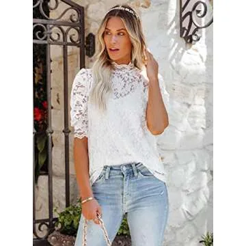 Show moreIntroducing the DOROSE Women's Elegant Lace Floral Tops – a perfect blend of style and comfort for your summer wardrobe! Made from high-quality lace fabric, these tops are designed to be soft, stretchy, and lightweight, making them ideal for all-day wear. The double-layer lining ensures they are not see-through, allowing you to step out confidently. The beautiful floral texture and elegant lace detailing bring a touch of sophistication, making this blouse a must-have piece for any fashion-forward individual. Its mock neck and ruffle neck design, combined with half sleeves, create a stunning silhouette that flatters all body types.