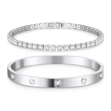 Show moreIntroducing the Doubgood Silver Bracelets for Women, a stunning set that redefines elegance and versatility in your jewelry collection. This exquisite bracelet set includes a silver bangle and a dazzling tennis bracelet, both available in three sizes: 6.5 inches, 7.0 inches, and 7.5 inches, ensuring a comfortable fit for most wrists. Crafted from premium 316L hypoallergenic stainless steel, these bracelets are not only durable but also provide smooth edges, making them suitable for sensitive skin. Each piece is designed with 5A cubic zirconia stones, securely inlaid to enhance their brilliance and sparkle, ensuring you shine on any occasion. The tennis bracelet shines brightly with its beautiful 14K real gold plating, guaranteeing a lasting finish that resists tarnishing and wear, while the fold-over clasp provides a secure and sturdy closure.