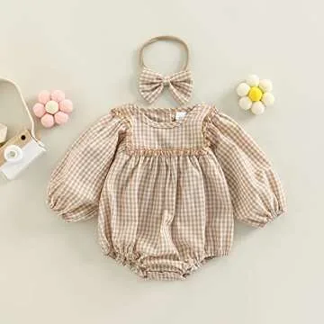 Douhoow Infant Baby Girl Plaid Romper Baby Sweatshirt Romper Ruffle Festival Clothes Fall Winter Outfits with Headband (Khaki plaid, 12-18 Months)