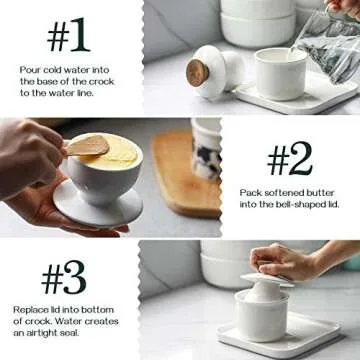 DOWAN Butter Crock for Counter, French Butter Keeper Crock with Water, Ceramic Airtight Butter Dish with Wood Knob Lid for Soft Butter, White
