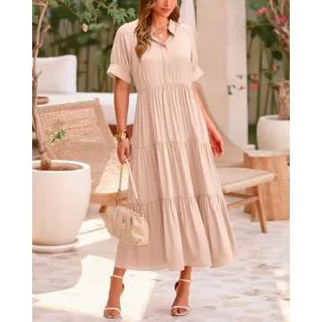 dowerme Woman Elegant Button V Neck Bohemian Beach Dresses Summer Vacation Outfits Soft Maxi Dress with Sleeve(Solid Apricot,Medium)