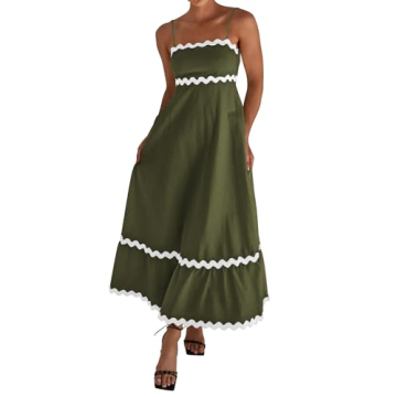 dowerme Women Summer Dresses 2024 Spaghetti Straps Sleeveless Smocked Rickrack Trim Boho Flowy Loose A-Line Midi Dress