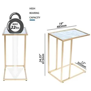 DOWLVN Rectangle Gold Marble Glass C Shaped Snack Drink Table, Side End Table Slide Under Couch for Sofa Coffee Laptop Living Room Bedroom Small Space