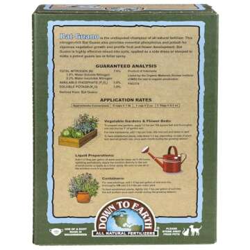 Show moreTransform your gardening experience with Down To Earth Bat Guano Mix, a premium fertilizer featuring a balanced 7-3-1 formula that supports vibrant plant growth and bountiful harvests. This organic product is certified by the Organic Materials Review Institute (OMRI), ensuring that your plants receive only the best in organic nutrition. Packed with readily soluble nitrogen, phosphorus, and micronutrients, this mix is a game changer for both novice and experienced gardeners.