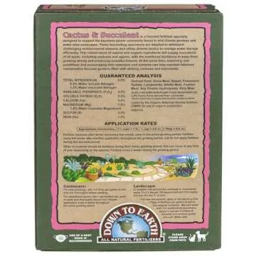 Show moreDown To Earth All Natural Fertilizers Organic Cactus & Succulent Mix 2-4-8, 5 lb is a revolutionary blend crafted specifically for desert-dwelling plants, ensuring that each succulent and cactus receives the optimal nutrients essential for thriving in challenging environments. Our formula comprises a robust mixture of natural and organic ingredients designed to enhance water management and soil quality. With an emphasis on sustainability and plant health, this fertilizer not only nourishes robust growth but also contributes to a conservation-focused approach, creating breathtaking garden landscapes filled with stunning cacti and succulents that capture attention and spark joy.