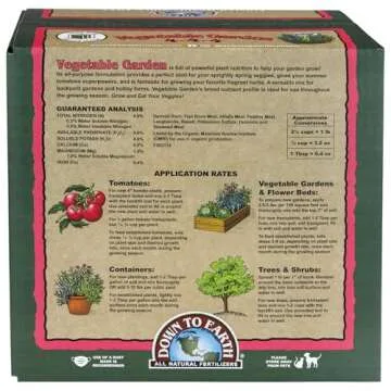 Why You Will Love This Product: Embrace your green thumb with the Down To Earth Vegetable Garden Fertilizer. By using this organic mix, you invite a wealth of health and vitality into your garden, enhancing the joy of growing your own food. Rediscover the satisfaction of watching your plants flourish, cooking with the freshest ingredients, and savoring the delicious flavors of homegrown produce. Whether you're cultivating a few pots on a balcony or expanding a large vegetable patch, you’ll appreciate the difference that quality nutrition makes in your plants’ lives.