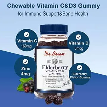 Show more Introducing the Dr. Brian Vitamin C D3 Gummies, a delightful way to boost your family's immunity and promote bone health with every chew. Perfectly crafted for kids and adults alike, these gummies combine the power of Vitamin C (160mg), Vitamin D3 (6mcg), and Zinc (4mg) to support a healthy immune system while ensuring strong bones. With a delicious elderberry flavor, these gummies transform vitamin intake into a tasty treat that kids will love and parents can trust.