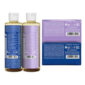 Show moreDiscover the rejuvenating essence of purity with the Dr. Bronner's Peppermint & Lavender Gift Set. This delightful variety pack elevates your bathing experience by offering a harmonious blend of two Liquid Soaps and two Bar Soaps, all infused with the refreshing scents of Peppermint and calming Lavender. Each 8-ounce bottle of liquid soap and 5-ounce bar soap is crafted with organic oils and designed not just to cleanse but to nurture your skin, while creating an inviting aromatic atmosphere that invigorates the senses.