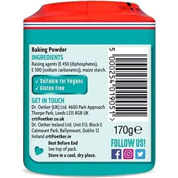 When comparing Dr Oetker Gluten Free Baking Powder with other brands, it stands out due to its trusted quality and formulation. Unlike many competitors, Dr Oetker ensures that their baking powder not only rises well but also enhances the flavor of your baked goods without any chalky aftertaste. Additionally, the convenient 170g tub makes it easier to use compared to products that come in less user-friendly packaging. This attention to detail in both formulation and usability positions Dr Oetker as a leader in gluten-free baking solutions.