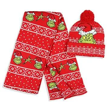 Show moreEmbrace the joy and cheer of the holiday season with the whimsical Grinch Holiday Scarf and Beanie Set from Bioworld. This stunning set masterfully combines a playful Grinch design with a cozy scarf and beanie, ensuring you not only showcase your festive spirit but also stay warm during those chilly winter months. Crafted using high-quality yarns, the vibrant imagery of the mischievous Grinch wearing a Santa hat, adorned with a delightful Christmas sweater pattern, makes this set an instant conversation starter. This is the ideal addition to your holiday wardrobe, encapsulating fun and merriment in every wear.