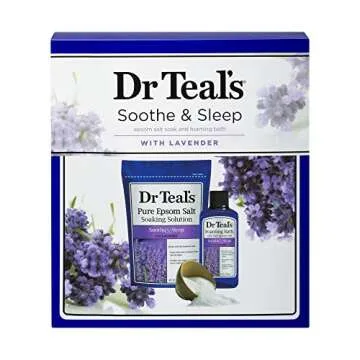 Show more Introducing a blissful gift that embodies relaxation and self-care: the Dr Teal's Lavender Epsom Salt and Foaming Bath Combo. This exquisite set features one 14 oz bag of Epsom Salts infused with calming lavender essential oils, and a 3 oz bottle of Foaming Bath, designed to soothe your body and mind after a long day.
