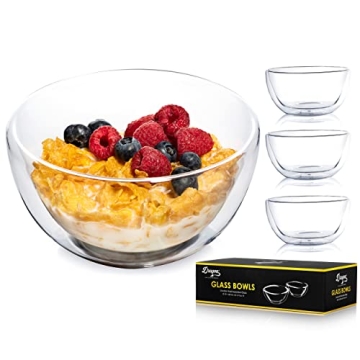 Show more Introducing the Dragon Glassware Clear Glass Bowl Set, a stunning and functional kitchen essential that makes every meal an elegant affair. Designed with a unique double-walled structure, these 23 oz bowls preserve the perfect temperature of your food, keeping hot dishes like soups and stews warm while ensuring that cold delights like ice cream and salads maintain their refreshing chill. Unlike traditional bowls, which can become dangerously hot to the touch, these bowls feature an outer layer that remains cool, providing comfort and convenience whether you're serving dinner or a delightful dessert. With four expertly crafted pieces in this set, you can entertain or enjoy individual servings with ease.