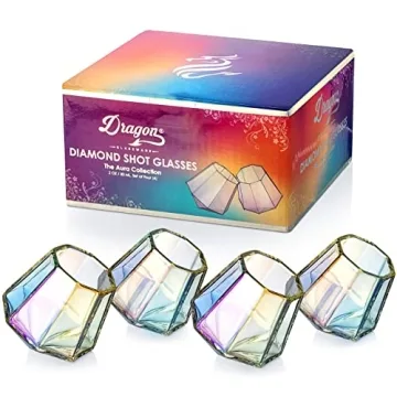 Show more Step into a realm of sophisticated drinking with the Dragon Glassware Diamond Shot Glasses. This exquisite set of four iridescent shot glasses transcends ordinary barware, introducing a stunning aesthetic paired with functional elegance. Crafted to capture the essence of refined drinking culture, these glasses feature a unique, sparkly iridescent effect that captivates the eye while pouring your favorite spirits. Picture the light dancing off the surfaces of these 2 oz shot glasses, effortlessly enhancing your cocktail parties or casual gatherings.