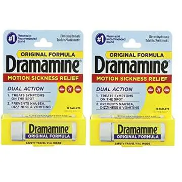 Show moreIntroducing the Dramamine Motion Sickness Relief Original Formula, your ultimate companion for comfortable travel. With each tablet containing 50 mg of a trusted formula, it’s expertly designed to tackle nausea, dizziness, and vomiting associated with various types of motion. Whether you’re on a scenic road trip, soaring high in an airplane, gliding smoothly on a train, or sailing across the waves, this powerful 2-pack of 12 tablets ensures you stay prepared for unexpected bouts of motion sickness. With Dramamine by your side, focus on enjoying the journey rather than worrying about the discomfort!