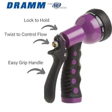 Show moreIntroducing the Dramm Revolver Heavy Duty 9 Pattern Quick Click Adjustable Garden Hose Spray Nozzle! This versatile tool is designed for all your outdoor watering needs, whether you're watering your beloved flowers, washing your car, or providing a refreshing bath for your dog. With an impressive selection of nine unique spray patterns, including mist, shower, jet, and soaker, you can easily switch from delicate watering to vigorous cleaning with just a flick of your thumb. The robust metal construction ensures that this nozzle is built to last, resisting wear and tear for years of reliable use, making it an essential tool for any conscientious gardener or caretaker. The nozzle is available in six stunning colors—red, orange, yellow, green, blue, and berry—adding a splash of vibrancy to your gardening accessories.