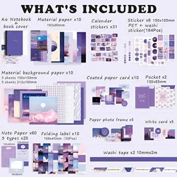 This kit not only equips you with the tools necessary for creative expression but also embraces an eye-catching purple aesthetic, featuring dreamy elements like clouds, oceans, and mountains, perfect for those seeking an artistic touch. This set is ideal for both seasoned scrapbook enthusiasts and beginners alike, as every component is handpicked to ensure a seamless and enjoyable crafting experience. Whether you're starting a journal, crafting a personalized planner, or designing a heartfelt gift, this kit caters to all of your creative endeavors.