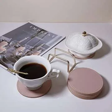 Drawwind Coaster Set of 6 with Metal Holder, Leather Coasters for Drinks with Cork Base, Pink Coaster for Coffee Table, House Warming Gift for New Home Decor