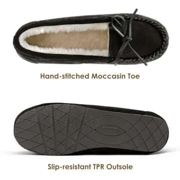 Designed for both indoor and outdoor wear, the stylish TPR rubber sole provides excellent grip, ensuring that you stay stable on various surfaces, whether you're traversing your living room or heading out for a quick errand. With attention to detail, these moccasin shoes also include charming bowknot leather laces to elevate their visual appeal. Available in size 9 and a classic black finish, they seamlessly blend functionality with fashion.