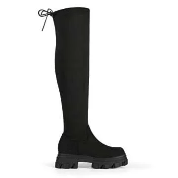 Show more Introducing these stunning over-the-knee boots, perfect for any fashionable woman looking to elevate her outfit! Crafted with a chunky lug sole, these boots offer both style and traction, ensuring you can walk confidently on any surface. Made with a soft, stretchy upper, they provide a comfortable, sock-like fit that molds to your leg for an amazing look and feel.