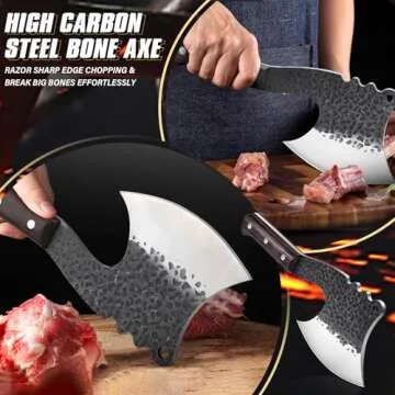 Show more If you're searching for the ultimate tool for meat preparation, look no further than this exceptional Butcher Knife for Meat Cutting. Hand-forged by skilled artisans, this knife showcases a wider, 5mm thickness axe blade designed specifically for tackling the toughest bones and meats with ease. Crafted from high-carbon steel with a hardness rating of up to 58 HRC, this heavy-duty meat cleaver promises reliability and durability in your kitchen.