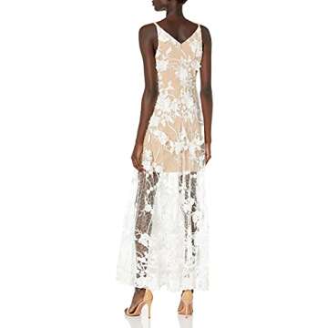 Dress the Population Women's Embellished Plunging Gown Sleeveless Floral Long Dress Dress, White/Nude Sidney, XS