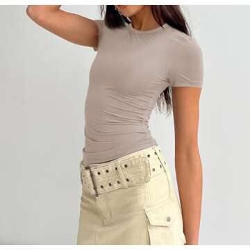 Dressmine Women Sexy Basic T Shirts Tops Summer Short Sleeve Round Neck Fitting Going Out Y2k Baby Tee Taupe S