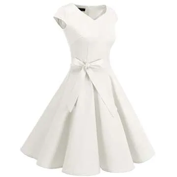 DRESSTELLS Women Classic Tea Dress 1950s Vintage Cocktail Dresses Sweetheart Neckline Swing Dresses with Cap Sleeves White M